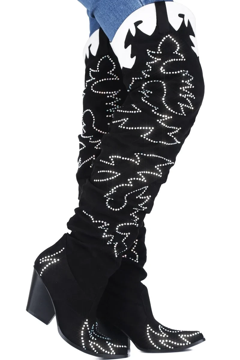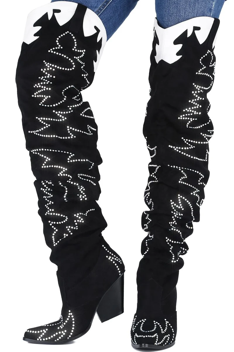 The rowdy saloon comes to starstruck silence when you swing open the doors and stroll in wearing these badass beauties. The Cape Robbin Rock Star Western Over The Knee Boots are old school Western with a sexy makeover, with a pointed toe, chunky heel, faux leather upper and a thigh high slouchy fit shaft, decorated all over in that classic cowboy-style embroidery. Saddle up and show them who’s the boss of this town.