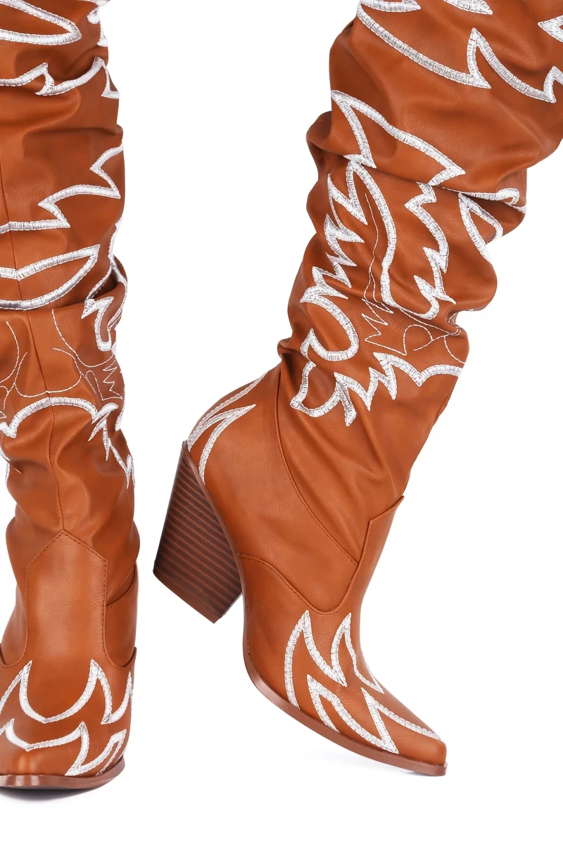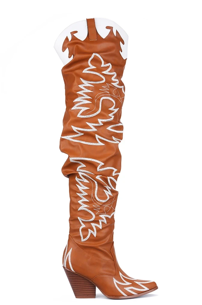 The rowdy saloon comes to starstruck silence when you swing open the doors and stroll in wearing these badass beauties. The Cape Robbin Rock Star Western Over The Knee Boots are old school Western with a sexy makeover, with a pointed toe, chunky heel, faux leather upper and a thigh high slouchy fit shaft, decorated all over in that classic cowboy-style embroidery. Saddle up and show them who’s the boss of this town.