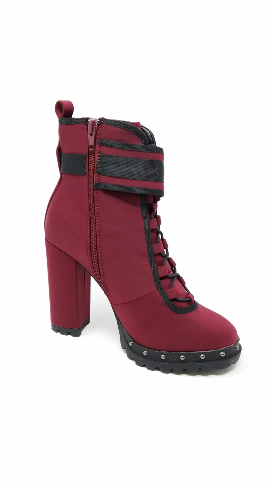 These booties feature a round toe silhouette, lace-up front with toggle closure, studded lug sole platform, and chunky wrapped heel. Finished with a back pull-tab, lightly cushioned insole, and side zipper closure.
